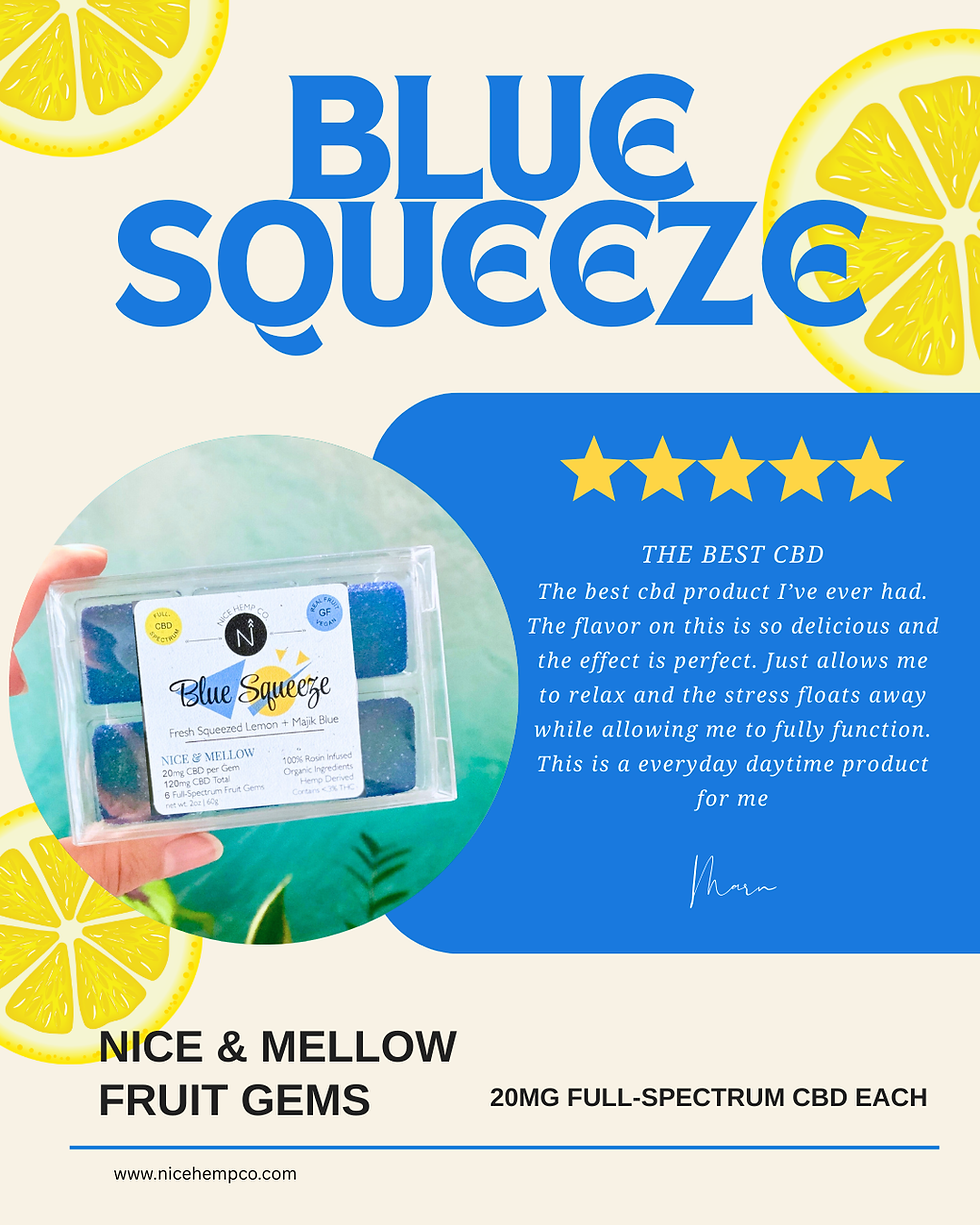 Nice Highlight will start out by featuring our beloved Blue Squeeze Fruit Gems, one of our very first products and a favorite among the Nice team. Behind the scenes, this is the most fought-over edible we produce! These are the ones we showcase at every in-store demo and sample out at every event and trade show we do. This is the product that turns people from "CBD doesn't do anything for me" or "I never feel anything" to "OMG, this is the best edible I've ever tasted!" and "I feel so good after eating that!" We've heard it over and over and witnessed countless facial reactions reflecting the conversion from even the most steadfast anti-hemp skeptics to true and loyal Nice fans. Welcome to the family!